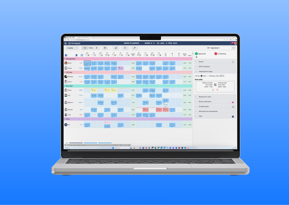 Lag vaktplaner raskt med maler og juster enkelt bemanningen under travle perioder, salgsarrangementer eller ferier.
